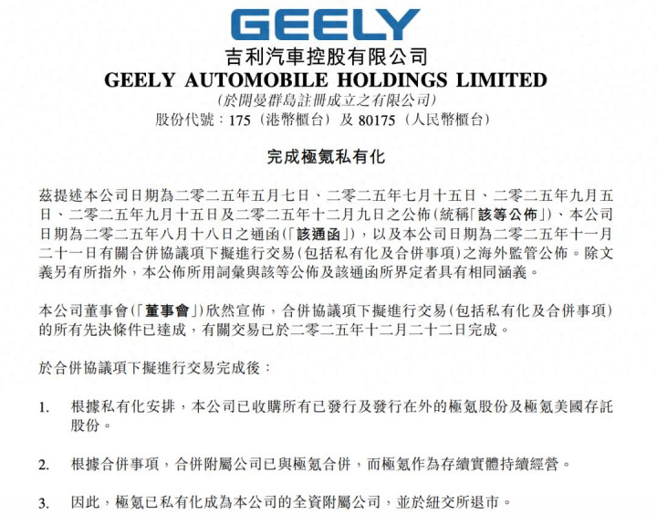 对于极氪的退市,吉利自己的说法是:“将以此次整合完成为全新起点,充分发挥战略协同与规模效应,持续加大在智能化、电动化核心领域的投入,为全体股东创造可持续的长期价值,向科技引领型全球汽车企业全面进化。”